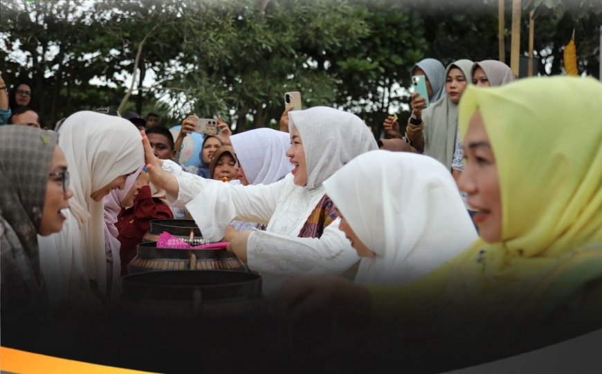 4. Ketua TP PKK dr. Yeni Dwi Putri, Ketua GOW Hj. Masni Taher, Ketua DWP Rohul Siska Irdaningsih ketika melakukan tradisi Potang Bolimau kepada sejumlah peserta yang hadir di kawasan Pujasera Batang Lubuh, Pasir Pengaraian, Selasa (17/2/2026).